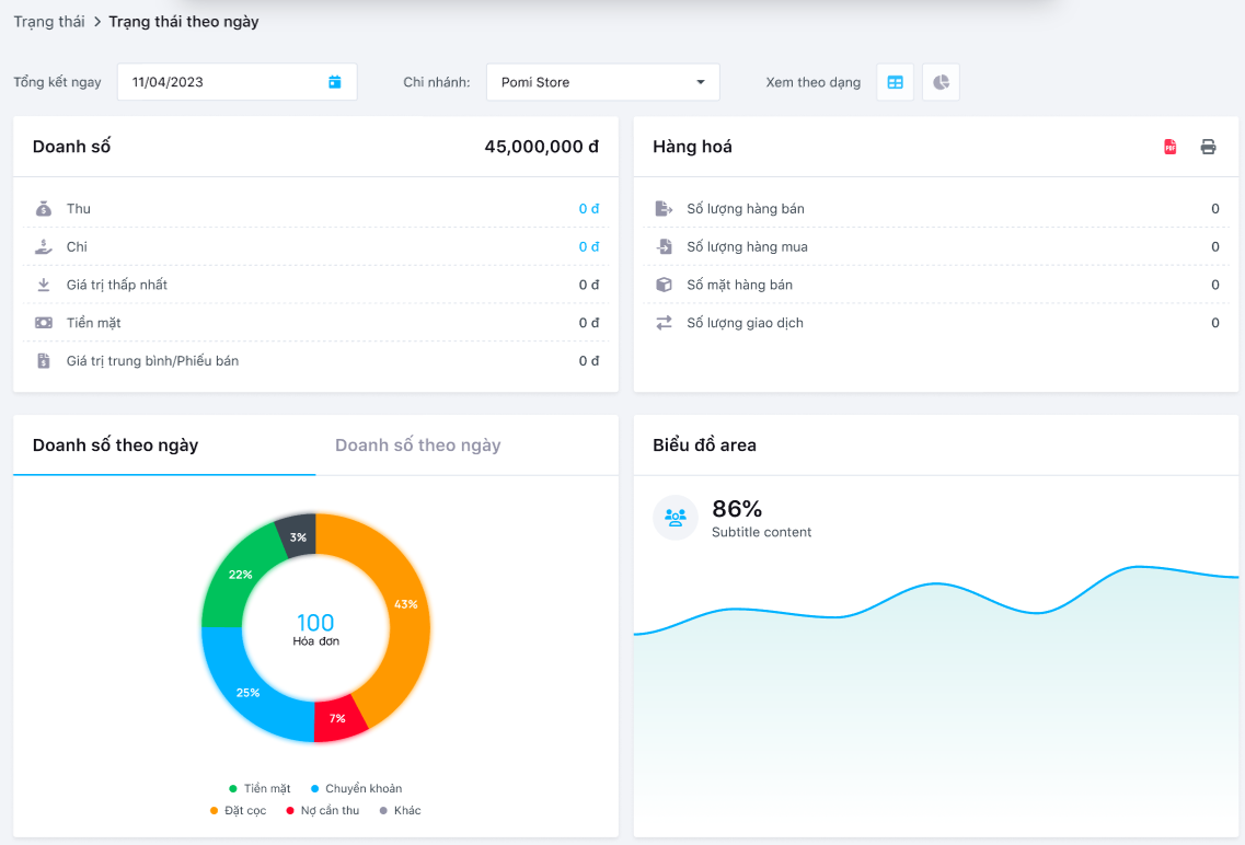- Tổng hợp doanh số, thu chi, tiền mặt… theo ngày hoặc theo chi nhánh cụ thể.
