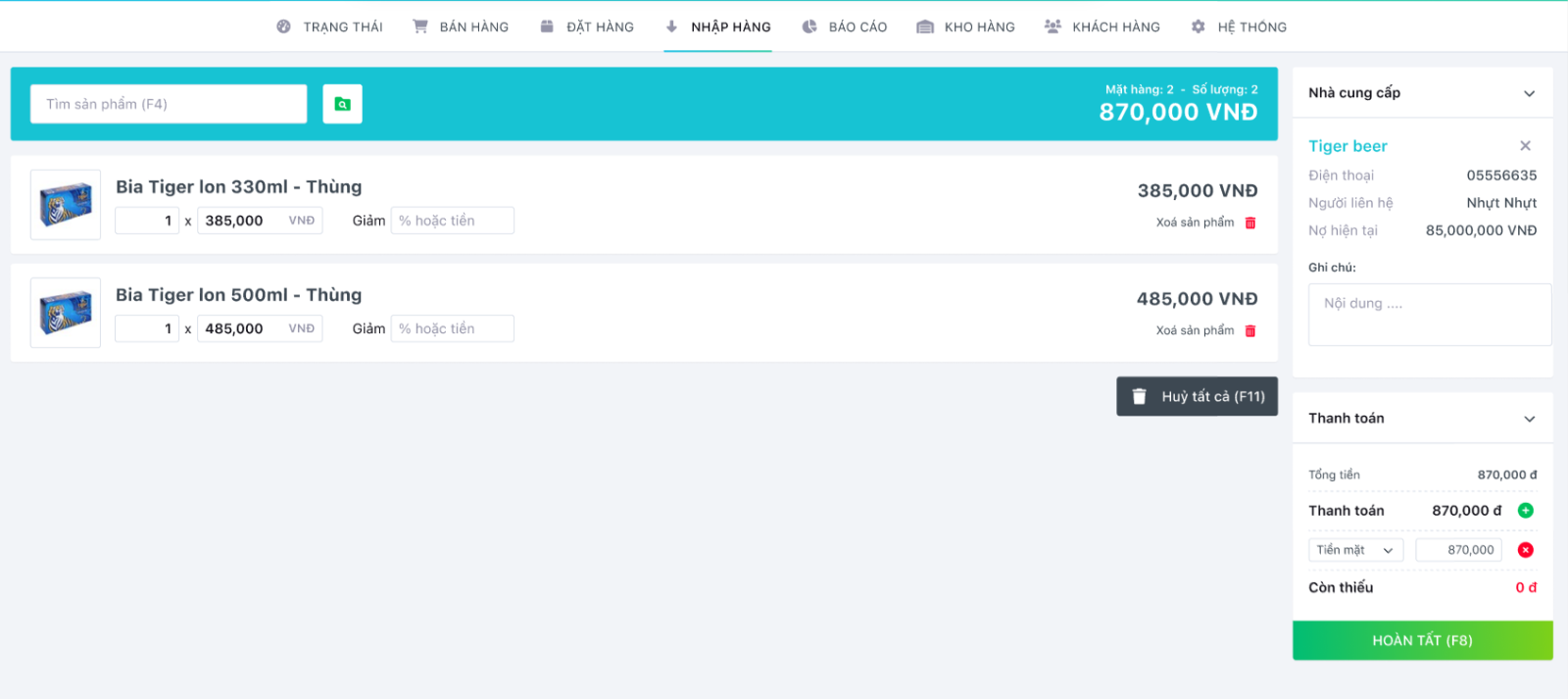 - Hỗ trợ nhiều loại thanh toán khi nhập hàng từ nhà cung cấp