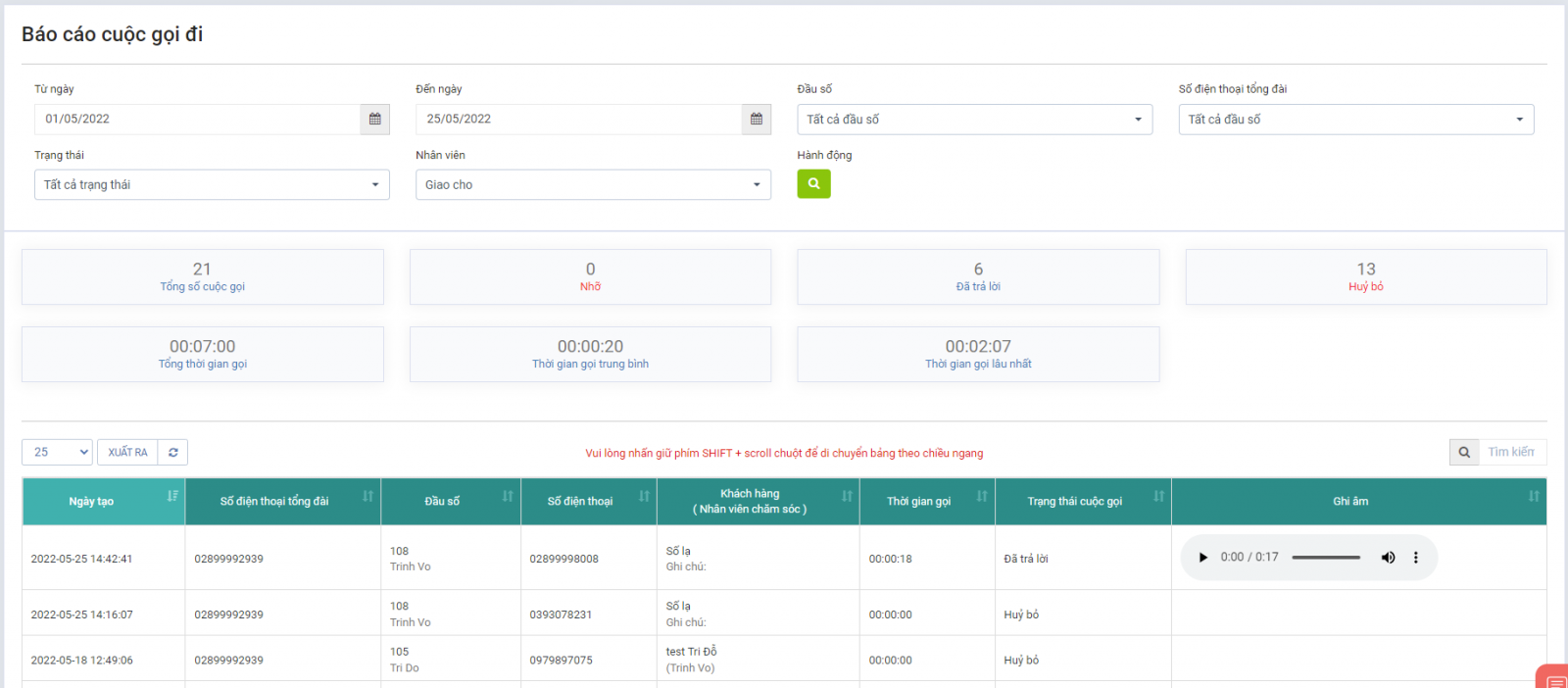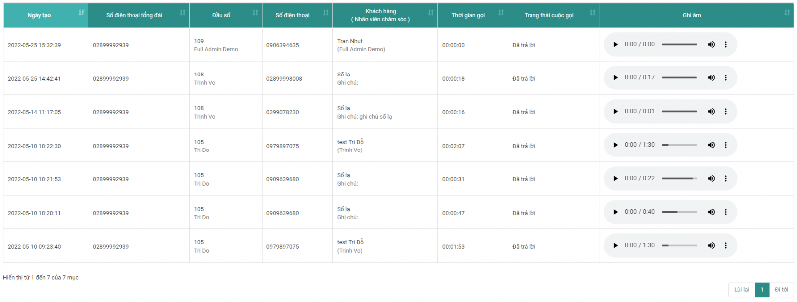 - Có thể kiểm tra và nghe lại tất cả nội dung cuộc trò chuyện của nhân viên và khách hàng. Kiểm soát nội dung và chất lượng cuộc gọi đến / gọi đi chính nhân viên của bạn. Điều này giúp nhân viên của bạn cẩn trọng hơn trong việc giao tiếp với khách hàng