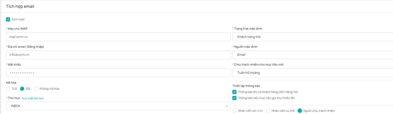 • Tích hợp email.Tự động tạo khách hàng tiềm năng vào hệ thống có email gửi vào hộp thư đã chỉ định
