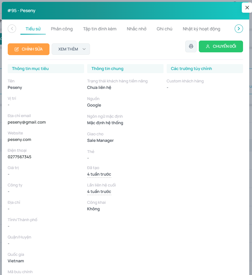 • Khi khách hàng tiềm năng đã vào quy trình bán hàng dễ dàng chuyển đổi khách hàng tiềm năng thành khách hàng trên hệ thống.